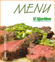 Polievka: Francúzska s mušličkami / Mäsový vývar s rezancami 0,3l 1) Bravčový steak zapekaný slaninou a nivou, ryža/hranolčeky 130g/200g 2) Šampiňóny plnené vajcom a syrom, varené zamiaky 300g 3) Kuracia tikka masala s jazmínovou ryžou a nan chlebom 200/200g 4) Bravčový steak zapekaný slaninou a nivou, šalát cvikla/červená kapusta 130g/150g